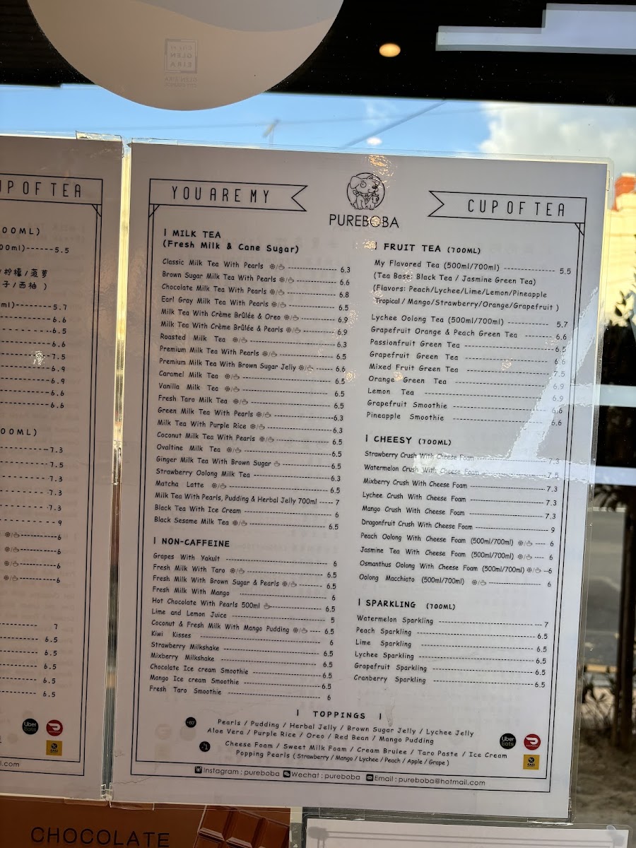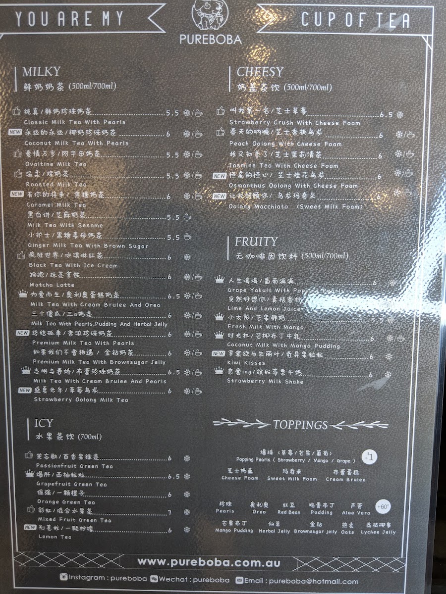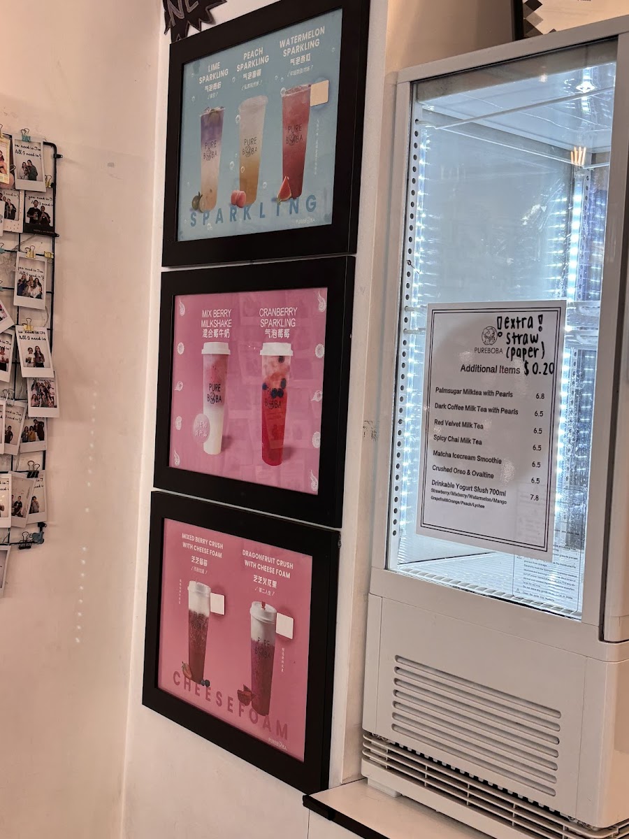 Pure Boba offers a diverse and unique menu that caters to a variety of tastes. For those craving something different, the Spicy Chai Milk Tea (NOT VG) and the indulgent Hot Chocolate With Pearls are must-tries. Their selection of milk teas features the rich Honeydew Milk Tea With Pearls, the comforting Vanilla Milk Tea, and the refreshing Classic Milk Tea With Pearls. If you're looking for a healthier option, their Drinkable Yogurt range is impressive, with choices like Purple Rice Yogurt and the tangy Kiwi Yogurt. For fruit enthusiasts, the Fruit Tea Drinks (Vegan) include flavorful options such as the Grapefruit Smoothie and Pineapple Smoothie, alongside a few inventive combinations like Grapefruit Orange & Peach Green Tea. Pure Boba also offers decaf options like the Fresh Taro Smoothie and Grape Yakult, and delicious milkshake choices like the Mix Berry Milkshake. The Sparkling Drinks section is equally tempting, featuring the Mango Sparkling and Lychee Sparkling for a refreshing, fizzy treat. A unique addition to the menu is their range of drinks topped with Cheese Foam, including the Osmanthus Oolong With Cheese Foam and Mixed Berry Crush With Cheese Foam, which add a creamy twist to your favorite beverages. Whether you're after something classic or experimental, Pure Boba provides an exciting menu for every palate.